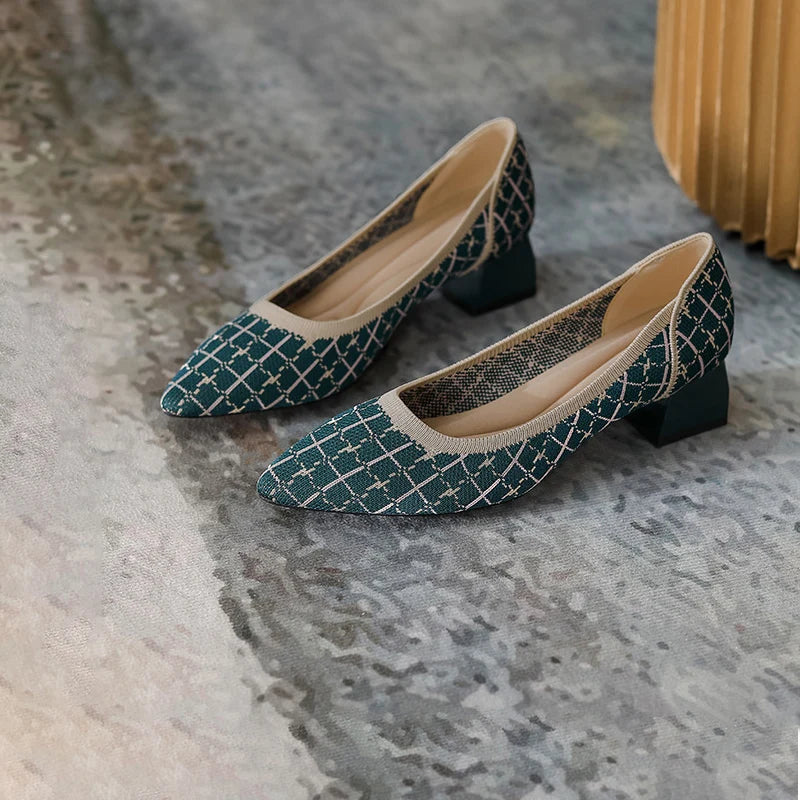 Step into a world of woven sophistication. These delicately knit pumps feature an intricate checkered design that adds subtle luxury to any look. Whether you're heading to a café, office meeting, or evening gathering, they carry you in comfort and style — no compromises.