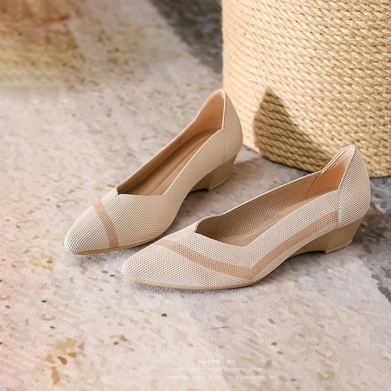 Crafted in breathable knit fabric with a flattering pointed toe and mid-height wedge, these pumps offer a poised and effortless lift. The latex foam insole provides gentle support with every step, while the wedge heel ensures graceful stability for all-day elegance.