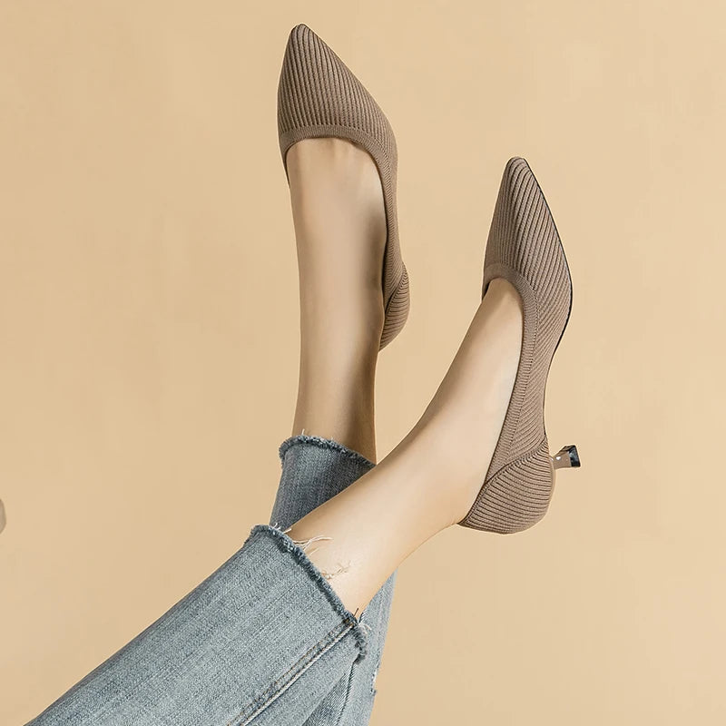 Crafted from breathable knitted fabric with a soft latex insole, this design ensures all-day ease. The 3 cm kitten heel delivers subtle elevation without compromising on stability, making them a timeless option for everyday sophistication.