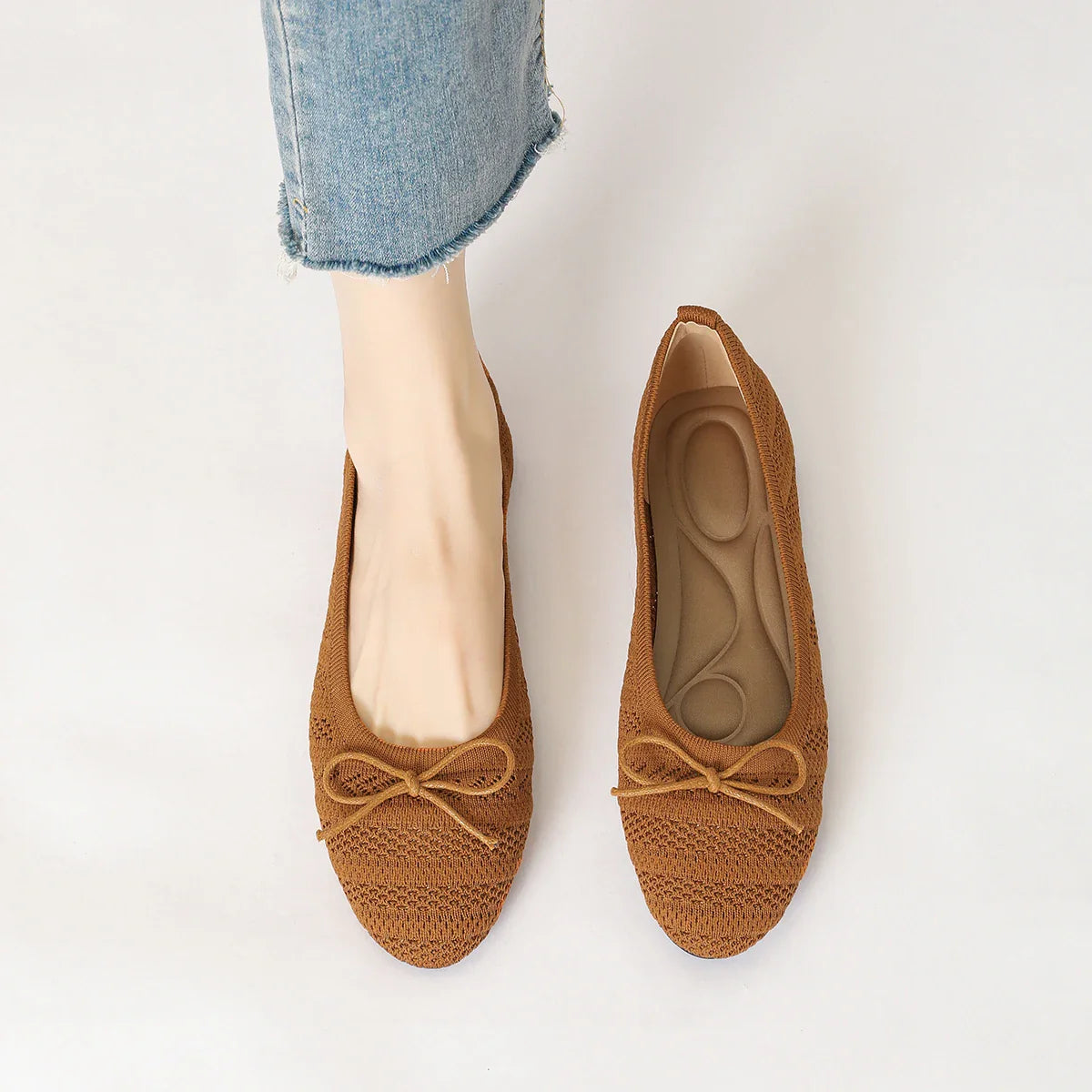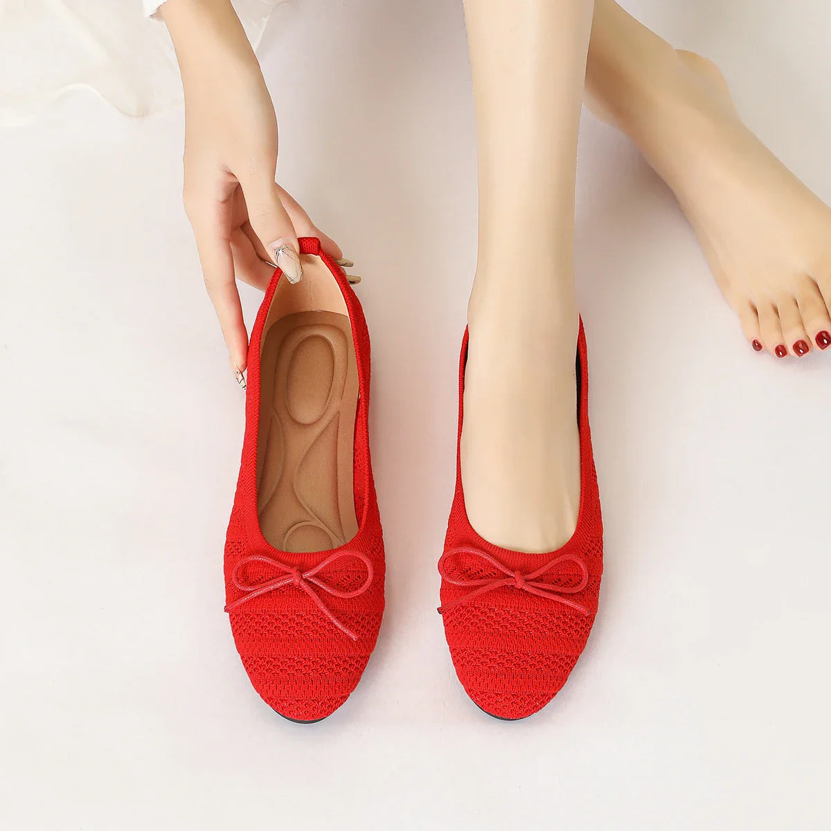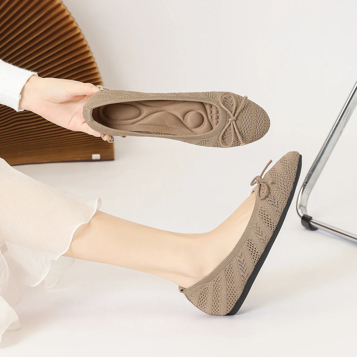 Crafted from breathable knit fabric, this flat allows natural airflow and adapts seamlessly to your foot. The elastic side bands provide secure flexibility, hugging gently without pressure — so you feel supported without even thinking about it.